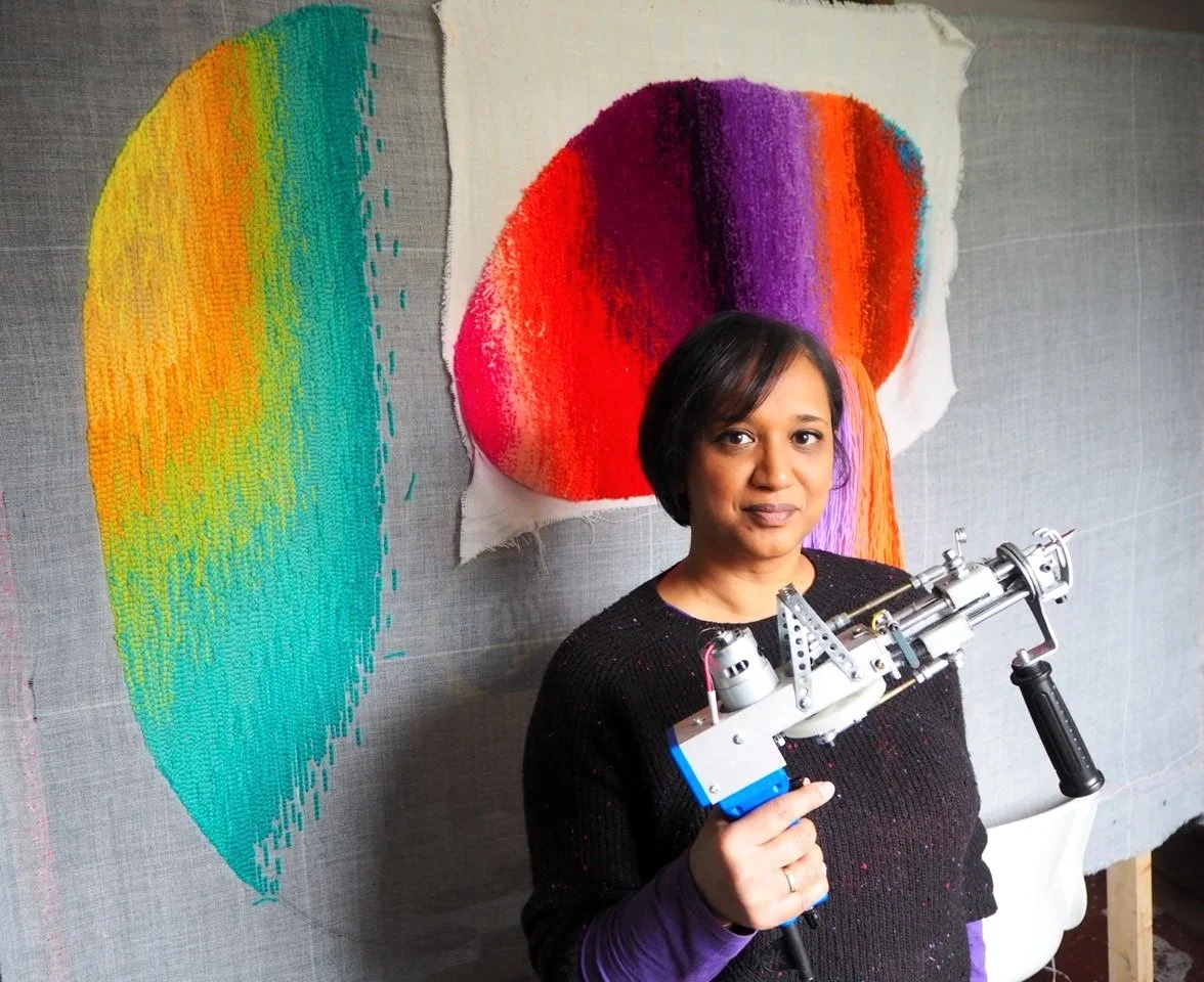 Working primarily with an electric tufting gun, Vencatasamy creates bold, tactile works she describes as painting with wool. Her pieces draw on colour, form, and material experimentation, resulting in modern-day tapestries that are playful in appearance while carrying emotional depth.